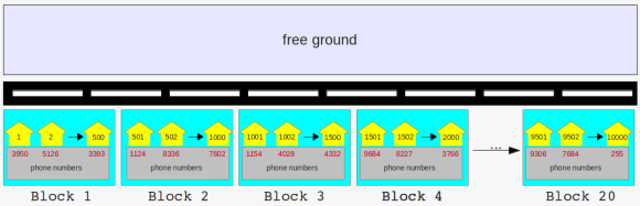 this time, image the following scenario: in your city there is a very, very, very long road with 10’000 houses on the right side, and because there is no sun at the left side there are no houses ( or for what ever reason you like :) ). each house is located next to the other and is identified by its house number. in addition, as lots of people love to do smalltalk by phone, there is a phone number for each house. in contrast to the phone numbers which are assigned random, the house numbers start by one for the first house and increase to ten thousand for the last one. house by house.
