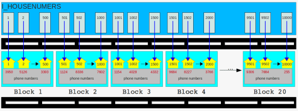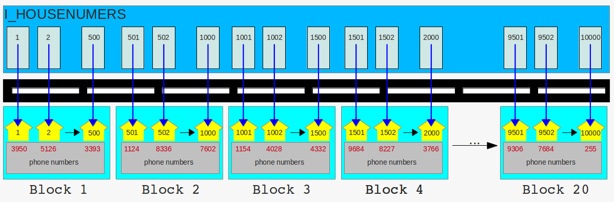 in the morning the postman wants deliver some letters to house numbers 501 – 1000. because the postman does not want to walk the whole road she goes directly to the index and searches for house number 500. happily for delivering the letters to the house with house number 501 the postman just needs to go directly to the block on the opposite of the street. the procedure is the same for the house numbers 502 to 1000. very short distances to go and no need to walk the whole road. all houses are located in the same block.